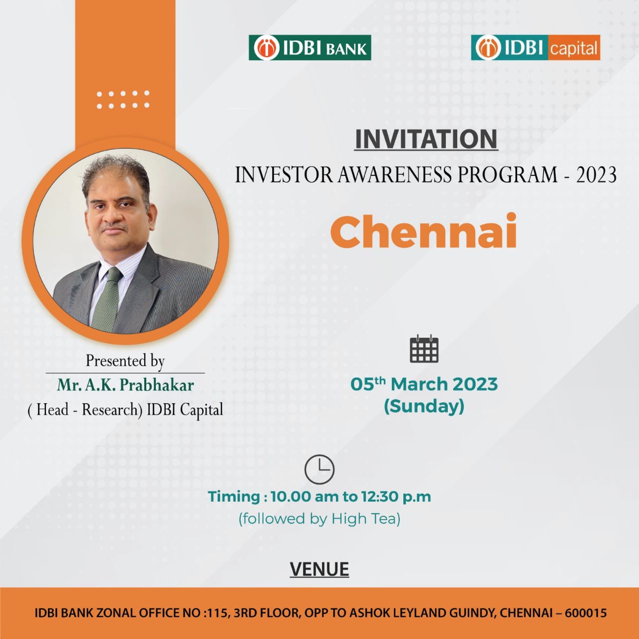 ஐடிபிஐ கேப்பிட்டல் நிறுவனத்தின் தலைவர் ஏ கே பிரபாகர் முதலீட்டாளர்களுக்கு பங்குச் சந்தை பற்றிய விழிப்புணர்வு கூட்டத்தை சென்னை கிண்டியில் நடத்துகிறார் .